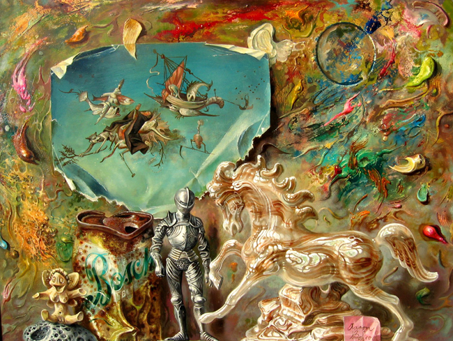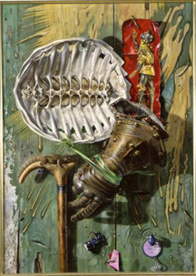 Artistically, Aaron Bohrod worked in the Regionalist and Socialist-Realist styles. This stood him in good stead from 1942 to 1945 when he was an artistic war correspondent in Europe for Life Magazine and also for work done on behalf of the Army Corps of Engineers. In the late 1940s, Bohrod became part of a growing tendency toward illusionism and fantasy called “Magic Realism.” His later trompe l’oeil still lifes, begun in the 1950s, are filled with allusions, puns, and jibes that refer to many cultures and different eras. He was successor to John Steuart Curry as artist-in-residence at University of Wisconsin-Madison.