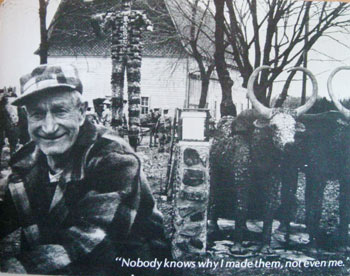 Born to German immigrant parents who settled in Wisconsin, Fred Smith’s early education included an abundance of north woods experiences, but no formal schooling, working in lumber camps for about 50 years and retiring in 1948. At that point he embarked on a sustained and energetic 15-year sculpture project with his earliest sculptures being free-standing, two dimensional bas-relief forms. As Smith evolved from building in low-relief to creating three-dimensional sculpture, his focus shifted to recording local history and ways of life that were rapidly changing around him. Fred Smith’s Wisconsin Concrete Park outlived its builder; in 1976, the site was purchased by the Kohler Foundation, Inc., a restoration project was begun in the spring of 1977, and in 1978, the site was gifted to Price County, for use as a county park and outdoor museum. Today, it is one of the finest artist environments in the United States.