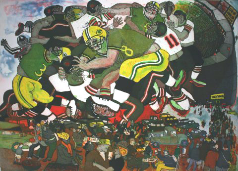Warrington Colescott was an important figure, as teacher and artist, in the post World War II flowering of printmaking at the University of Wisconsin- Madison. He was one of the innovators in advancing technique and imagery in print culture that made Madison one of this country’s creative hotspots. His etchings continue to be recognized internationally for the satiric bite of his narrative subject matter which often comments on the state of the world as seen through his eyes. Narration is at the core of his art. The source of its journalistic aspect goes back to a childhood fascination with comic strips and to his college student involvement in political and sports cartoons.